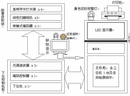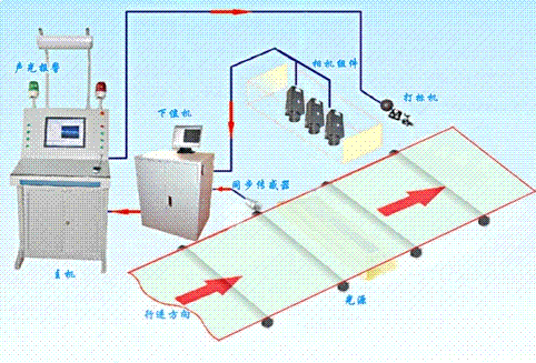 主機報警燈亮,報警音發出,顯示缺陷位置;收料工位的報警燈響亮,協助工人剔除廢料;貼標機動作,在次品張貼標;打印機打印統計信息。