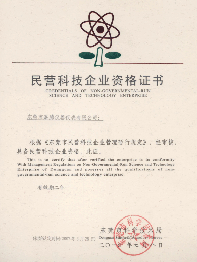 2010年7月8日,我嘉騰公司再次通過東莞市科學技術局審核,取得民營科技企業資格證,并獲取了市科學技術局的企業資金獎勵。