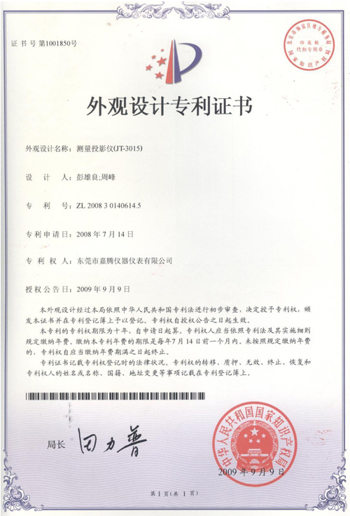 “測量投影儀JT-3015”榮獲外觀設計專利證書