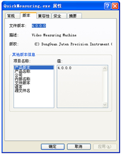 二次元影像測量儀、二次元檢測儀、二維影像儀QuickMeasuring測量軟件需要重新安裝時,因軟件重裝會將原有的數據覆蓋,導致之前設置或補償好的參數等數據無法復原,所以我們有必要在安裝系統或軟件前將數據文件重新備份,可在一次安裝軟件時直接使用,不用再做重復的數據參數設置工作。在備份數據之前請先確認QuickMeasuring測量軟件安裝目錄,默認路徑C:\Program Files\QuickMeasuring(S)下(對電腦桌面QuickMeasuring圖標鼠標右鍵->屬性->快捷方式->查找目標),打開軟件所在目錄,找到QuickMeasuring.exe文件,確認QuickMeasuring.exe文件版本(鼠標右鍵->屬性->版本),如圖: